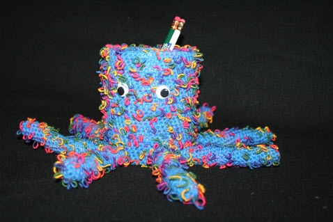 With the pattern made up by yours truly from a picture, he'll love to hold all your pencils, pens, highlighters, scissors, and what I would use him for - Crochet hooks!! :) He is fairly big, and tall because I used a baby formula can (washed, of course!), so I'm sure he would also work for knitting needles!